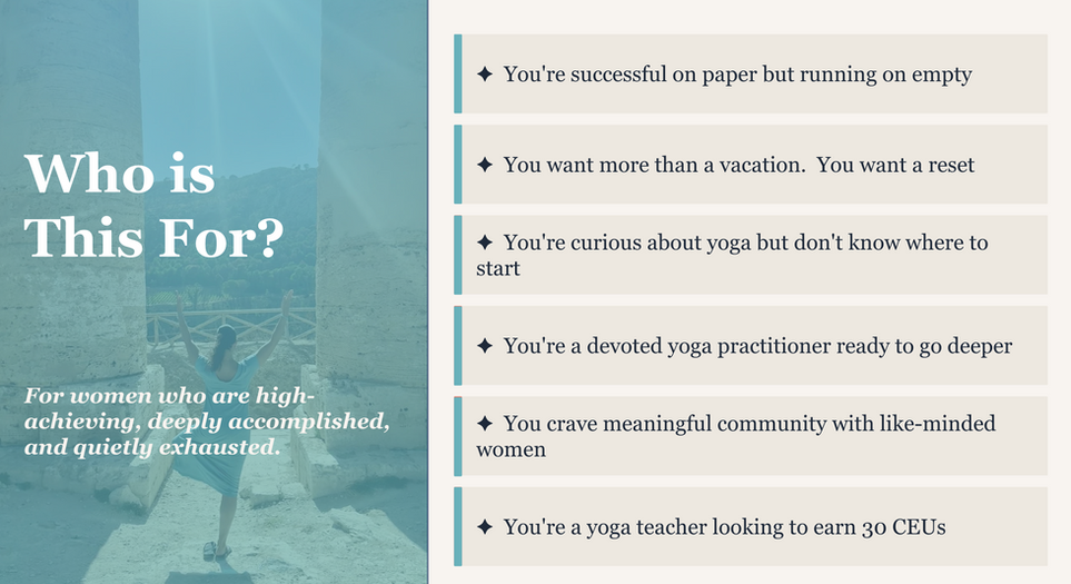 Return Home with Somatic Yoga tools and a Plan: This is about actionable tools that matter, and meaningful practices in several modalities of yoga that you can take with you to continue the retreat vibe long after the experience is over.